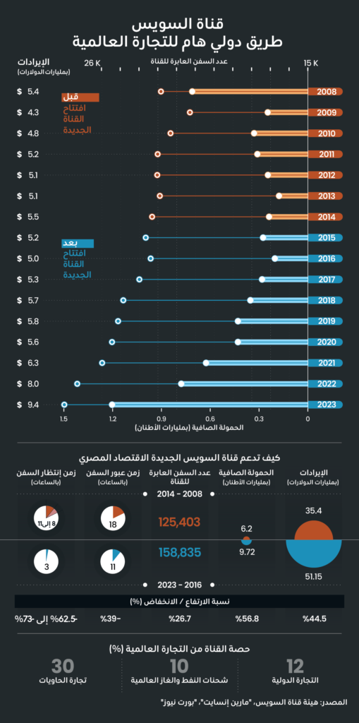 - تتمكن الناقلات العملاقة، والمحملة جزئيًا من المرور في قناة السويس.